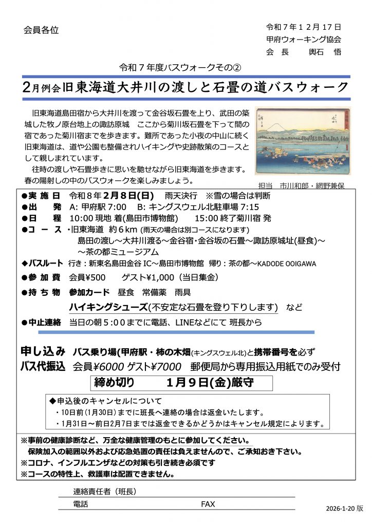 2025年12月17日 / 最終更新日時 : 2026年2月10日 admin 月例ウォーク 令和8年2月例会 旧東海道大井川の渡しと石畳の道バスウォーク 撮影場所: 大井川の島田宿側河川敷 音声資料♪: 大井川バスウォークを10倍楽しくする小話です (約12分) 安全確保のため、天候等によりコースを変更する場合があります。