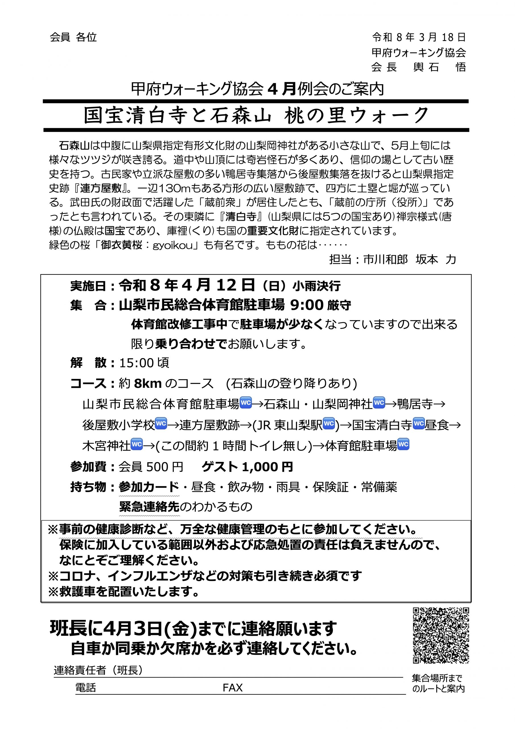2026年3月18日 / 最終更新日時 : 2026年3月18日 admin 月例ウォーク 令和8年4月例会 国宝清白寺と石森山 桃の里ウォーク 山梨市HPより 国宝 清白寺仏殿 清白寺Youtube ご覧ください